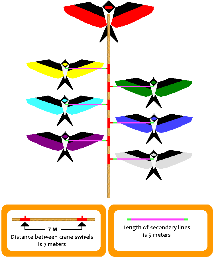 - The Main Line is around 130 Meters long and contains 10 crane swivels, 7 Meters apart, for the standard 10 Swallow Flock package.