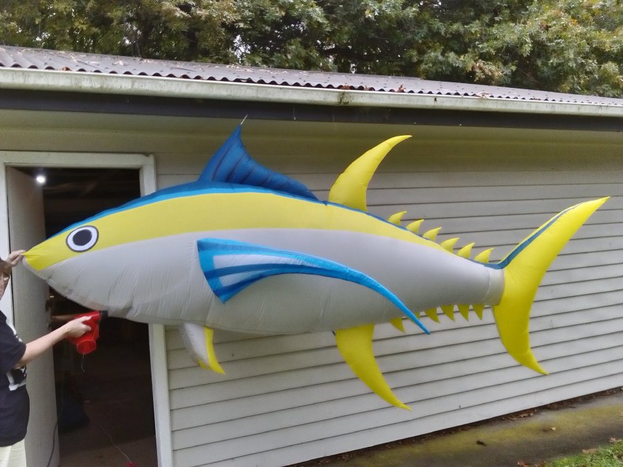 I decided to make a big fish, well bigger than the 4.5 meter Idol, so I thought of the Tuna, the Yellow Fin Tuna specifically.The first prototype was 3 meters long and you can see an image below as my wife is holding on to it.
