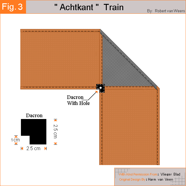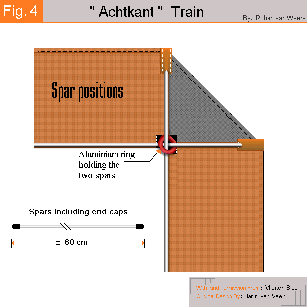In Fig 4 you can see the position of the ring that holds the two spars together, we will deal with this in the next stage so no need to place them on just yet.In stronger winds, the bottom kite, can be spared with 3 mm all round.